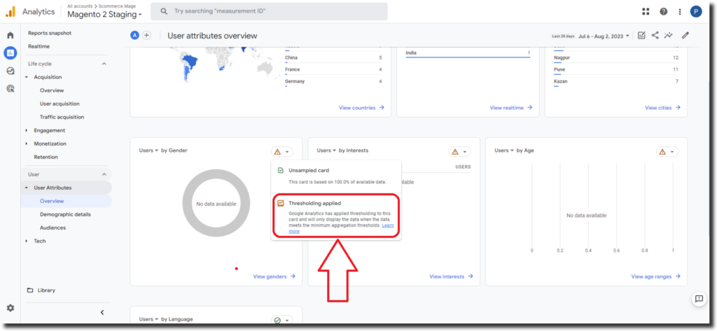 For example, report thresholding will be applied if you have a report that shows the number of users by age group and gender (user counts as metrics), and you filter by a specific country (dimension or filter that can potentially identify individual users), and you have less than 10 users from that country in the last 30 days (low user count in the specified date range).