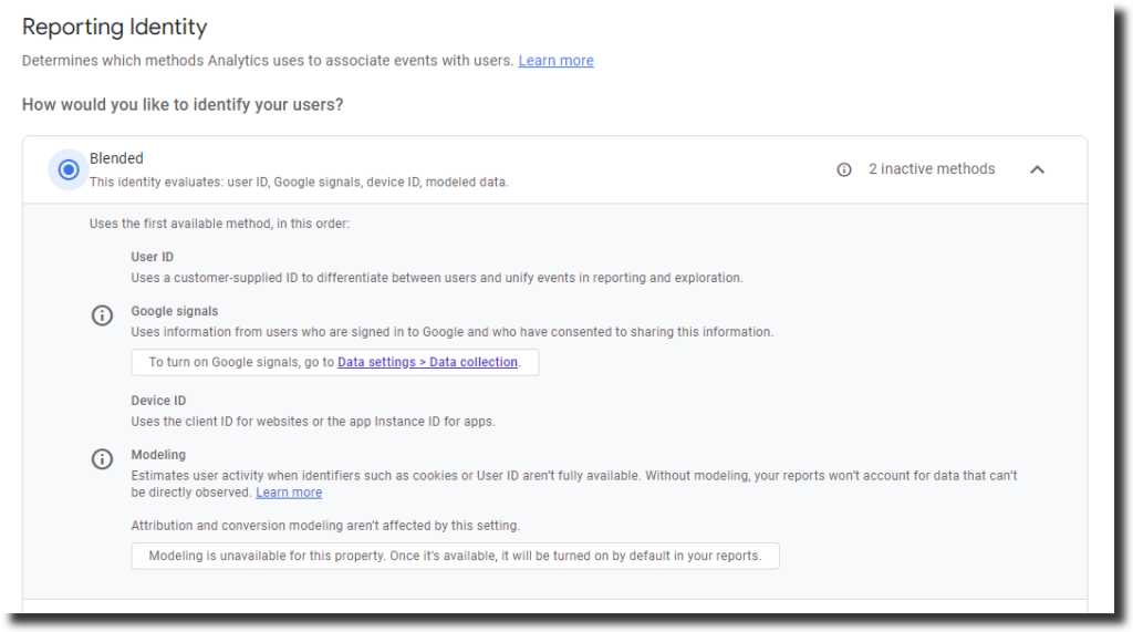 - Blended: This option uses a combination of User ID, Google signals, Device ID, and Modeled data if nothing else is available. This option provides the most comprehensive and holistic view of user behavior, but it also requires more configuration and consent from users.