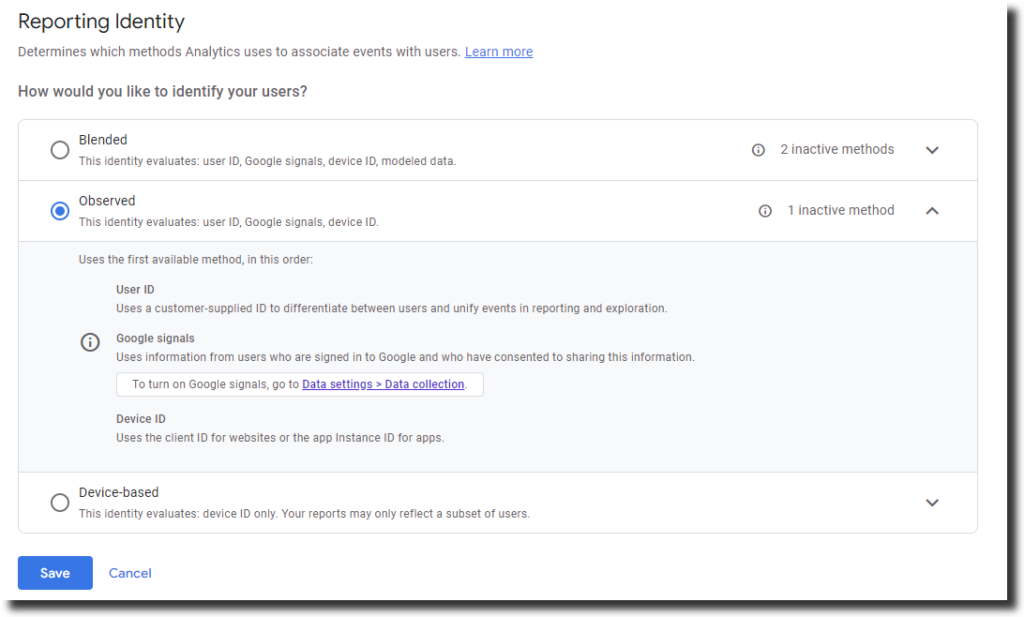 - Observed: This option uses User ID if available, followed by Google signals if enabled, and then Device ID. This option is similar to Blended, but it does not use Modeled data to fill in the gaps when user data cannot be observed. This option may provide more accurate data, but it may also result in lower user counts.